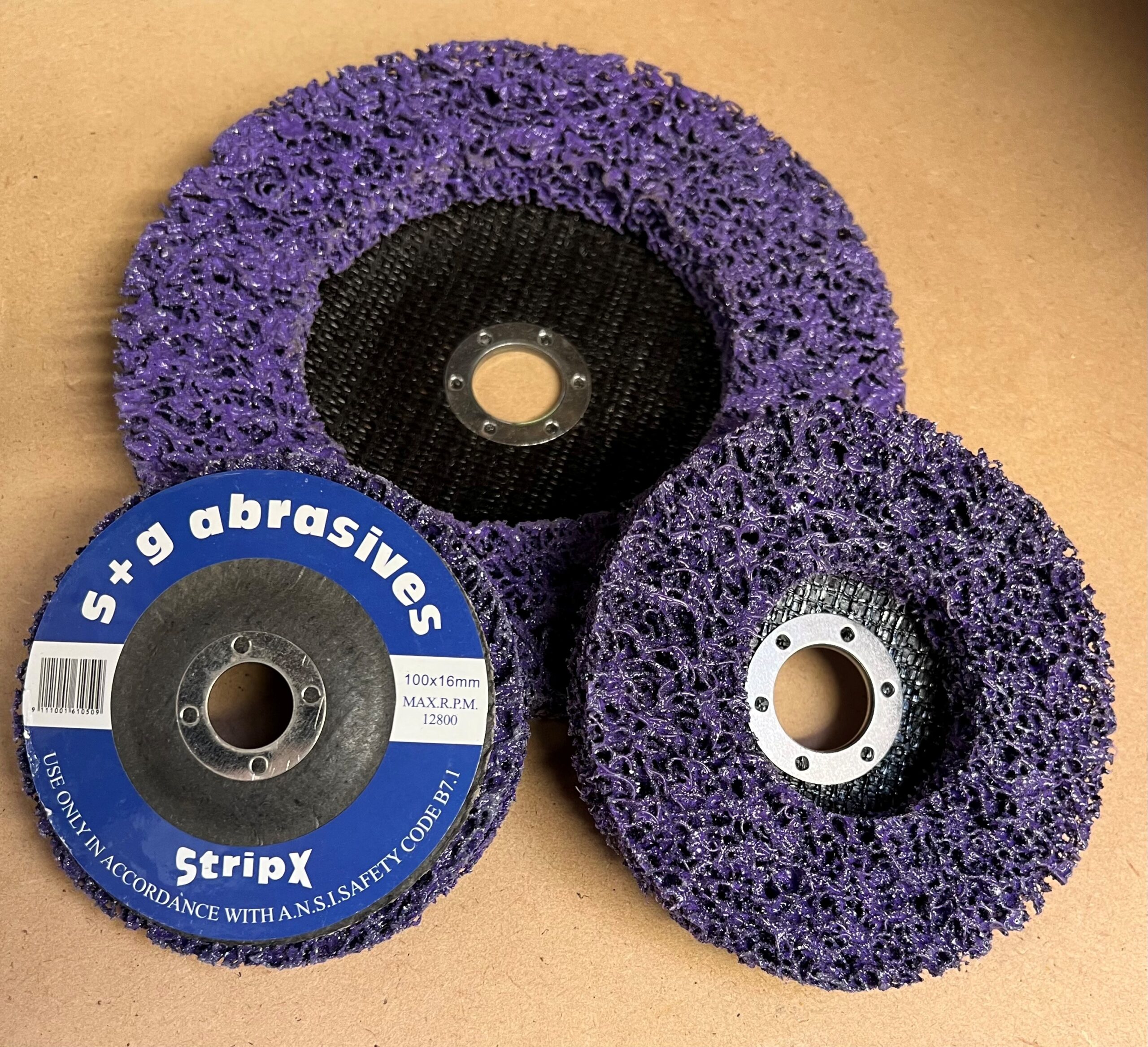 Heavy-duty, non-woven abrasive discs used for aggressive surface preparation and removal of materials. These discs utilize an open-web, high-strength fiber structure with abrasive minerals, such as silicon carbide or aluminum oxide, to remove rust, paint, coatings, mill scale, and adhesives without significantly altering the underlying base material.